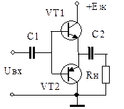 Схема двотактного підсилювального каскаду з одним джерелом живлення показана на рис. 7.6, б. Принцип роботи каскаду. При подачі позитивної напівхвилі вхідного сигналу транзистор