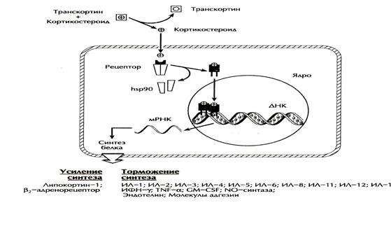 3.1. ГЛЮКОКОРТИКОСТЕРОИДЫ Механизм действия. ГКС пассивной диффузией проникают через клеточную мембрану в цитоплазму клетки, где связываются со специфическим рецептором. Активированный комплекс ГКС-рецептор может проникать в ядро клетки, где происходит его связывание с определенными участками ДНК и последующая специфическая модуляция клеточных эффектов посредством прямой или непрямой регуляции транскрипции определенных генов-мишеней. Указанные гены ответственны за синтез белковых молекул, вовлеченных практически во все звенья воспаления, при этом ГКС тормозят синтез так называемых провоспалительных веществ и усиливают синтез белков, обладающих противовоспалительной активностью (рисунок 3.2., таблица 3.1).