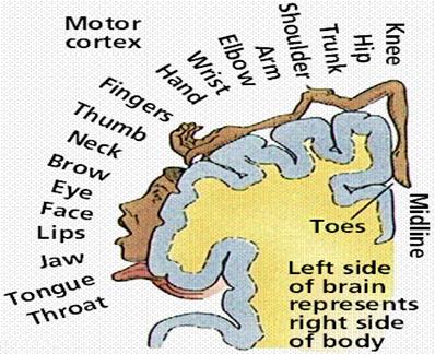 Parts of the сerebral cortex and the relative areas that are devoted to controlling various body regions