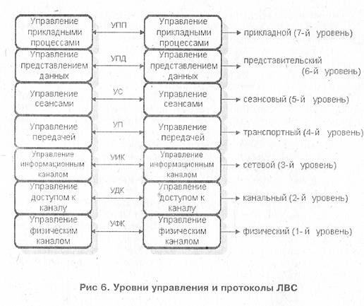 ЛВС, как система распределенных ресурсов, должна основываться на следующих принципах: · единой передающей среды; · единого метода управления; · единых протоколов; · гибкой модульной организации; · информационной и программной совместимости. Международная организация по стандартизации (ISО), основываясь на опыте многомашинных систем, который был накоплен в разных странах, выдвинула концепцию архитектуры открытых систем - эталонную модель, используемую при разработке международных стандартов. Часть открытой системы, выполняющая некоторую функцию и входящая в состав того или иного уровня, называется объектом. Правила, по которым осуществляется взаимодействие объектов одного и того же уровня, называются протоколом. Протокол - набор правил и процедур, регламентирующий обмен данными. Протоколы определяют порядок обмена информацией между сетевыми объектами. Они позволяют взаимодействующим рабочим станциям посылать друг другу вызовы, интерпретировать данные, обрабатывать ошибочные ситуации и выполнять множество других различных функций. Суть протоколов заключается в регламентированных обменах точно специфицированными командами и ответами на них (например, назначение физического уровня связи - передача блоков данных между двумя устройствами, подключенными к одной физической среде). Для протокола передачи данных требуется следующая информация: 1. Синхронизация. Под синхронизацией понимают механизм распознавания начала блока данных и его конца. 2. Инициализация. Под инициализацией понимают установление соединения между взаимодействующими партнерами. При условии, что приемник и передатчик используют один и тот же протокол, синхронизация устанавливается автоматически. 3. Блокирование. Под блокированием понимают разбиение передаваемой информации на блоки данных строго определенной максимальной длины (включая опознавательные знаки начала блока и его конца). 4. Адресация. Адресация обеспечивает идентификацию различного используемого оборудования, которое обменивается друг с другом информацией во время взаимодействия. 5. Обнаружение ошибок. Под обнаружением ошибок понимают установку и проверку контрольных битов. 6. Нумерация блоков. Текущая нумерация блоков позволяет установить ошибочно передаваемую или потерявшуюся информацию. 7. Управление потоком данных. Управление потоком данных служит для распределения и синхронизации информационных потоков. Так, например, если не хватает места в буфере устройства данных или данные не достаточно быстро обрабатываются в периферийных устройствах, сообщения и(или) запросы накапливаются. 8. Методы восстановления. После прерывания процесса передачи данных используют методы восстановления, чтобы вернуться к определенному положению для повторной передачи информации. 9. Разрешение доступа. Распределение, контроль и управление ограничениями доступа к данным вменяются в обязанность пункта разрешения доступа (Например, " только передача" или " только прием"). Каждый уровень подразделяется на две части: · спецификация услуг; · спецификация протокола. Спецификация услуг определяет, что делает уровень, а спецификация протокола - как он это делает. Причем каждый конкретный уровень может иметь более одного протокола.