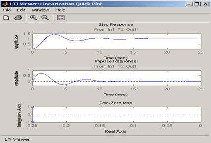 Fig.4.9 The transfer function of the control system in question and its characteristics (step response, impulse response and pole-zero map).