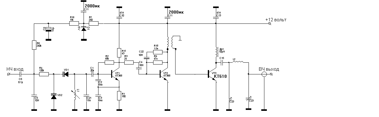 Усилитель мощности собран на двух транзисторах КТ606А и КТ934Д. КТ606А применен по экономическим соображениям, так как он дешев и максимальную мощность которую можно снять с него это 2 Ватта которой раскачивается КТ934Д с которого потом и снимают 15-17 Ватт ВЧ мощности на частоте 100MHz. Все каскады в УМ работают в классе C. На выходе оконечного каскада стоит П-контур который согласовывает кабель с передатчиком и который одновременно давит высшие гармоники передатчика.