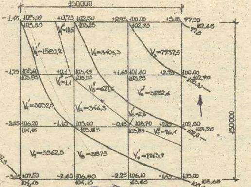 Аналогічно для всіх інших верхівок квадратів. Робочі відмітки зі знаком “+” вказують на необхідність насипання ґрунту, зі знаком " –" – на необхідність зрізання. Підрахунок об’ємів виїмки і насипу визначаємо як суми окремих фігур, об’єми яких визначаємо за формулою Стрельчевського як для перехідних квадратів, так і для однойменних (див. рис. 3.1). Наприклад, для першого квадрата