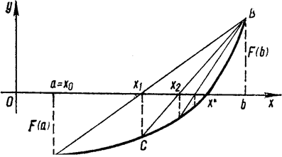 Число x1 примем за первое приближение корня х*. Далее, применяя этот же прием к отрезку изоляции [x1; b], на концах которого функция F(x) принимает противоположные знаки, получим второе приближение корня x2: x2 = x1 - Этот процесс можно продолжать неограниченно. Описанный процесс называется методом хорд. В результате получим последовательность вложенных отрезков[a; b] É [x1; b] É [x2; b] É... É [xn; b] É ... с неподвижным концом b. Последовательные приближения xn (n = 1, 2,...) к точному значению корня х* вычисляются по формуле