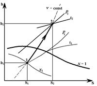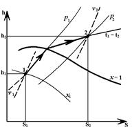 В настоящей работе изучаются закономерности только одного, изохорного процесса. Если закрытый сосуд, из которого предварительно удален воздух, частично заполнен водой, то остальное пространство заполнено водяным паром и при определенной температуре он представляет некоторое количество влажного водяного пара массой т и объемом vх. Состояние 1 этого пара и, следовательно, положение точки 1 в рv -диаграмме (рис. 4), а также особенности дальнейшего изменения состояния будут сильно зависеть от соотношения массы воды и пара, т.е.