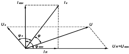 2. Відкладається вектор струму IR, співпадаючий по фазі з напругою UR і струм Ікон, що випереджає Uкон на кут φ кон ≈ 90°. Кутом діелектричних втрат нехтують. 3. Складаючи геометрично вектори струмів IR і Ікон, одержують вектор струму до розгалуження (у котушці) Ік. 4. Відкладають напругу на котушці Uк в сторону випередження струму в котушці на кут φ к. 5. Складаючи вектори Uк і UR, одержують вектор повної напруги кола U і кут φ всього кола.