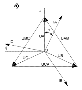 Рис. 2.6.2. Векторні діаграми лінійних і фазних напруг і струмів для симетричного (а) і несиметричного (б) режимів навантаження індуктивного характеру