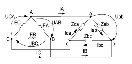 На рис. 2.7.1 прийняті наступні позначення: При з’єднанні фаз трикутником фазні і лінійні напруги однакові. При симетричному навантаженні