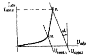 Оскільки|тому що| цей опір сполучений|з'єднаний| із|із| стабілітроном|стабілітрон| послідовно, з|із| точок m і n (рис. 2.9.4) ВАХ| стабілітрона|стабілітрон| для зворотної напруги|напруження| проведемо дві прямі під кутом|ріг, куток| a (tg = Rвн|) до вертикалі з урахуванням|з врахуванням| масштабного коефіцієнта Визначивши таким шляхом Ux| min| і Ux| max|, знайдемо