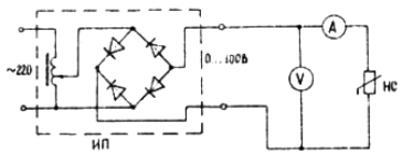 Оскільки|тому що| стабілітрон має несиметричну|несиметричний| ВАХ|, спочатку знімають частину|частка| ВАХ| в прямому напряму|направлення| (I квадрант) (рис. 2.9.1, в), а потім - в зворотному (III квадрант). На схемі (рис. 2.9.5) ИП| - регульоване джерело живлення|харчування|. За допомогою ЛАТРа можна регулювати випрямлену напругу|напруження| в межах 0...100 В. 3). Змінюючи|зраджуючи| ЛАТРом значення напруги|напруження|, що підводиться, від нуля|нуль-індикатор, нуль-множина, нуль-последовність, нуль-елемент| до номінального значення для кожного нелінійного|нелінійний| елементу, зняти ВАХ| кожного з трьох досліджуваних нелінійних|нелінійний| елементів. Дані вимірювань|вимір| звести в табл. 2.9.1. При цьому струм|тік| в колі|цеп, ланцюг| не повинен перевищувати вказаного в таблиці значення.