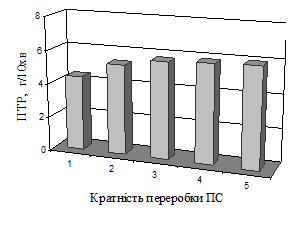 Рис. 8. Зміна властивостей ПС в процесі багаторазової переробки: а - ударна в’язкість, б - міцність при розтягу, в - молекулярна маса, г - показник текучості розплаву. Незважаючи на деструктивні процеси, що протікають при багаторазовій переробці ПС, про що свідчить зменшення молекулярної маси, його основні фізико-механічні властивості змінюються незначно. Слід відзначити, що вміст відходів в сумішах з товарним продуктом не повинен перевищувати 20 %, в іншому випадку різко погіршується якість одержаних виробів. Полімерні відходи, які утворилися на стадії синтезу полімеру менше зазнають термічного та механічного впливу, ніж відходи переробки тому можливо їх додавати до первинних полімерів у концентрації до 50 %.