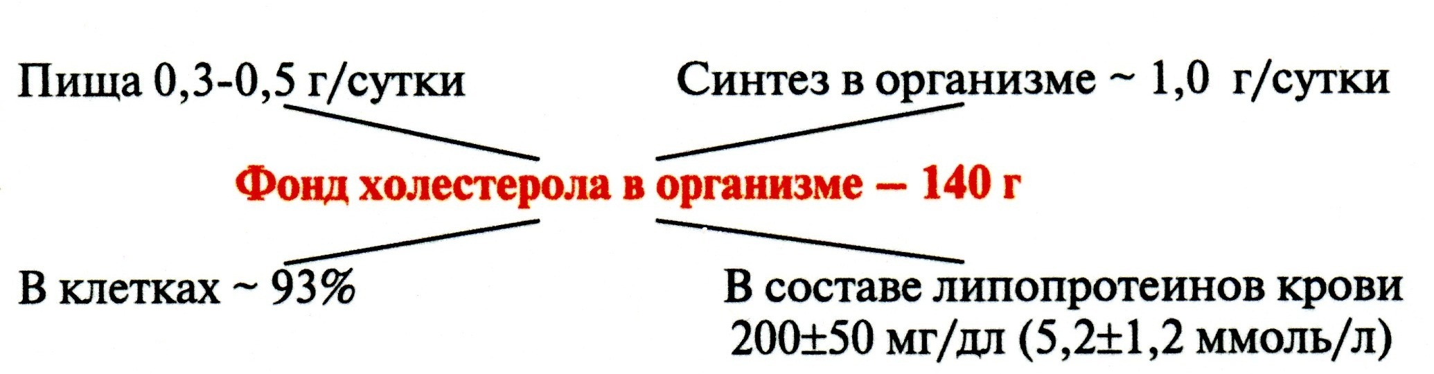 Основные функции холестерола: Компонент мембран, отвечает за вязкость гидрофобного слоя; Компонент монослоя липидов на поверхности липопротеинов; 3) предшественник желчных к-т, стероидных гормонов, витамина D3. В организме человека содержится 140 г холестерола и его эфиров.