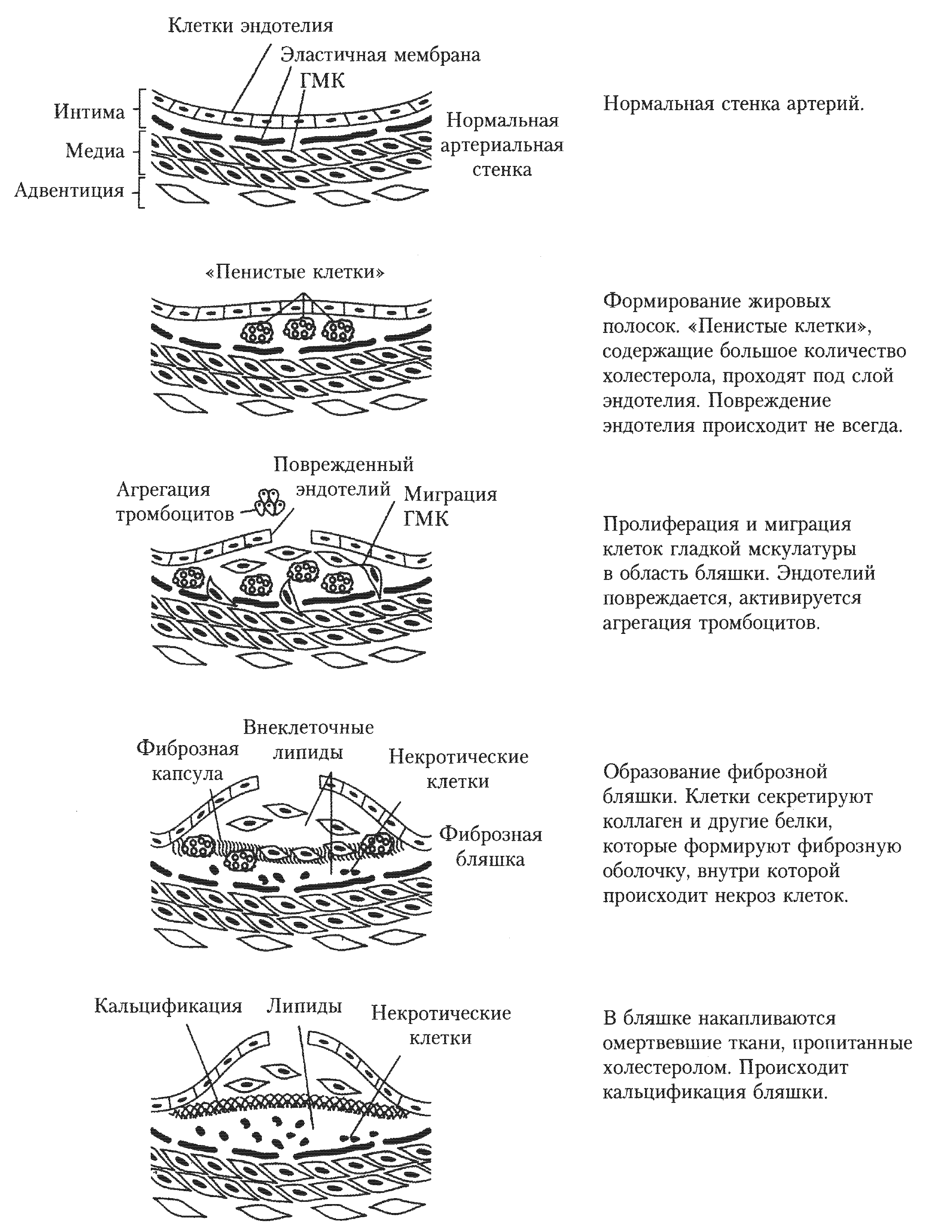 2) Гипокалорийная диета с низким содержанием углеводов и липидов => ¯ синтез ХС в печени и ¯ [ЛПНП] в крови; 3) Прием витаминов С, Е, А, которые снижают ПОЛ и замедляют образование ЛПНП* с повышенной атерогенностью; 4) Использование препаратов, например, «Омакор», содержащих ω -3 жирные кислоты – эйкозапентаеновую (С20: 5) и доказапентаеновую (С22: 5), так как они являются предшественниками простациклинов (РGI3) и тромбоксанов (ТХА3), которые снижают риск тромбообразования. 5) Использование препаратов, адсорбирующих желчные кислоты в кишечнике и «размыкающих» цикл энтерогепатической циркуляции, например «Холестид», «Холестирамин» («секвестранты желчных кислот»). 6) Использование ниацина (никотиновой кислоты и ее производных), который уменьшает образование ЛПОНП и липолиз в жировой ткани => ¯ [ЛПНП] в крови и замедляется ПОЛ; 7) Фибраты, которые, действуя через рецепторы, катаболизм ЛПОНП, увеличивая синтез ЛП-липазы; синтез апоА-I, апоА-П, ¯ содержание ТАГ в крови и содержание ЛПВП. 8) При хронической гиперхолестеролемии и атеросклерозе назначают статины – обратимые конкурентные ингибиторы ГМГ-КоА-редуктазы (Мевакор, Закор и др.). Статины полностью подавляют синтез ХС в печени. => в печени ¯ образование ЛПОНП и => ¯ образование из них ЛПНП в крови. Также, в печени синтез RЛПНП и эндоцитоз ЛПНП. Дополнение к лекции: «Развитие атеросклеротической бляшки в клетках эндотелия кровеносных сосудов» (схема из большого синего (зеленого) учебника):