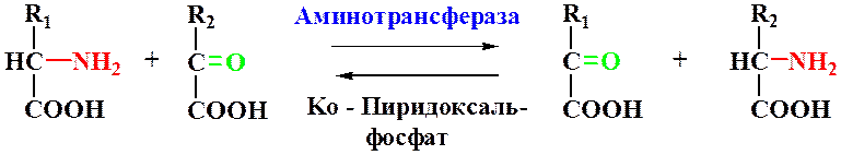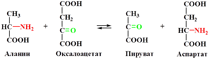 Трансаминироваться могут все аминок-ты, кроме Лиз, Тре, Про и Гли. Название фермента строится так: сначала название донора аминогруппы (аминок-ты), затем название акцептора аминогруппы (кеток-ты) и затем слово аминотрансфераза (или трансаминаза): Пример: