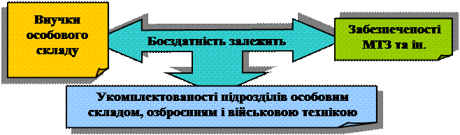 Бойова готовність – це такий стан підрозділів, коли вони здатні у мінімально короткі терміни здійснити перехід з мирного у воєнний стан і успішно виконати бойове завдання, згідно з призначенням. Бойова готовність повинна забезпечувати: − своєчасне приведення підрозділів у вищі ступені бойової готовності та введення в бій передових сил оборони; − виконання бойового завдання в умовах застосування противником високоточної зброї, засобів радіоелектронної боротьби (РЕБ) і захист від зброї масового ураження (ЗМУ); − спроможність виконувати бойове завдання під час раптового нападу повітряного противника; − своєчасну відбудову порушеної бойової готовності підрозділів. Бойова готовність передбачає: − визначений ступінь укомплектування підрозділів особовим складом, озброєнням і бойовою технікою; − наявність відповідних запасів матеріальних засобів; − підтримання у справному стані та готовому для використання озброєння і бойової техніки; − високу бойову підготовленість підрозділів, перш за все польове уміння особового складу, бойову злагодженість підрозділів; − необхідну підготовку командних кадрів і штабів, а також високий моральний стан і психологічну підготовку, міцну військову дисципліну і організованість особового складу. Основними показниками бойової готовності підрозділів є боєздатність військ та час, необхідний для підготовки підрозділів до виконання бойових завдань. Боєздатність - це можливість підрозділів вести бойові дії і виконувати бойові завдання відповідно до їх призначення. Боєздатність є головним, визначальним показником бойової готовності і залежить від таких факторів, які зазначені на рис.1.