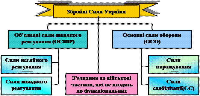 Об’єднані сили швидкого реагування(ОСШР) – сили бойової готовності, які спроможні без доукомплектування виконувати визначені завдання. У їх склад входить частина військ (сил), які здатні до негайного реагування на кризові ситуації. Вони складатимуть до 30% від загального бойового складу Збройних Сил України мирного часу та розподілятимуться на сили негайного реагування і сили швидкого реагування. Сили негайного реагування призначені для негайного реагування на загрози, стримування, недопущення та нейтралізації збройних конфліктів на стадії їх зародження. Укомплектованість особовим складом – більш ніж 90%, озброєнням і військовою технікою – на 100%. Сили швидкого реагування призначені для нарощування (посилення) сил негайного реагування, створення угруповання з метою адекватного реагування на рівень загроз, а у разі виникнення збройного конфлікту, недопущення переростання його в локальну війну. Укомплектованість особовим складом – більш ніж 70%, озброєнням і військовою технікою – на 100%. Основні сили оборони(ОСО)– сили мобілізаційної готовності, спроможні до виконання завдань після відмобілізування і приведення у бойову готовність. Частка Основних сил оборони від загального бойового складу Збройних Сил України мирного часу становитиме до 70% і вони розподілятимуться на сили нарощуваннята сили стабілізації. Сили нарощування призначені для нарощування зусиль, підсилення при необхідності ОСШР при виконанні ними завдань ліквідації (локалізації, нейтралізації) збройного конфлікту. Укомплектованість особовим складом – до 50%, озброєнням і військовою технікою – не менш ніж на 80%. Сили стабілізації призначені для розгортання з’єднань і військових частин, необхідних для гарантованого виконання завдань ОСШР і Силами нарощування, та мають бути готовими до застосування в усіх можливих формах ведення воєнних дій, завершення ліквідації збройного конфлікту та стабілізації обстановки. Укомплектованість особовим складом – до 30%, озброєнням і військовою технікою – не менш ніж на 80%. Бази, центри, склади, арсенали матеріально-технічного забезпечення відноситимуться до системи забезпечення життєдіяльності Збройних Сил України. Основними шляхами, які забезпечать готовність функціональних структур для виконання завдань за призначенням, є: − формування багатофункціональних, мобільних з’єднань і військових частин Збройних Сил України на основі модульного принципу, з можливістю створення бригадних, батальйонних тактичних груп на базі штатних підрозділів різних родів військ, приведення до визначених показників ОСШР та ОСО; − збільшення питомої ваги бойових частин, з’єднань і військових частин постійної готовності та зменшення питомої ваги структур логістики, військових навчальних закладів, установ і організацій, інших забезпечуючих військових частин і установ; − виведення зі складу видів Збройних Сил Україниарсеналів, баз і складів, військових частин забезпечення загальновійськової номенклатури та передача їх до складу Об’єднання сил забезпечення. Формування на базі решти арсеналів, баз і складів, військових частин центрів забезпечення за номенклатурами відповідних видів Збройних Сил України. За розрахунками, формування визначених функціональних структур забезпечить надійне виконання покладених на Збройні Си