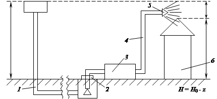 Рис. 3. Схема отбора воды из пожарного водопровода: 1 – водопровод; 2 – ПГ; 3 – пожарный автонасос; 4 – пожарный рукав; 5 – пожарный ствол; 6 – защищаемое здание