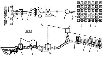 Рис. 4. Схема объединенного водоснабжения: 1 – водоисточник; 2 – водоприемник; 3 – станция I подъема; 4 – сооружения очистки воды и станция II подъема; 5 – водонапорная башня; 6 – магистральная линия; 7 – распределительные трубопроводы; 8 – вводы в здания; 9 – потребители воды