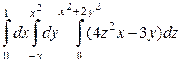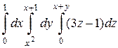 Тогда тройной интеграл сводится к повторному > Int(Int(Int(3*z-1, z=0..x+y), y=x^2..x+1), x=0..1)= int(int(int(3*z-1, z=0..x+y), y=x^2..x+1), x=0..1);