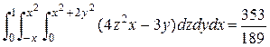 б) Введем повторный интеграл и вычислим его > Int(Int(Int(4*z^2*x-3*y, z=0..x^2+2*y^2), y=-x..x^2), x=0..1)= int(int(int(4*z^2*x-3*y, z=0..x^2+2*y^2), y=-x..x^2), x=0..1);