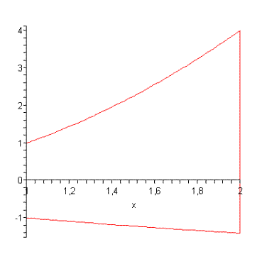 2. а) Область интегрирования представляет собой множество > m: =plot([-sqrt(x), x^2], x=1..2, color=[red, red]): > with(plots): > k: =implicitplot(x=1, x=1..2, y=-1..1, color=red): > k1: =implicitplot(x=2, x=1..2, y=-sqrt(2)..4, color=red): > display([m, k, k1]);