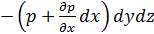 Пусть p=p (x, y, z) - давление в жидкости. Выделим внутри жидкости куб (рис. 2.2) с бесконечно малыми рёбрами dx, dy, dz и рассмотрим его равновесие под действием поверхностных и массовых сил. Возьмём частный случай объёмных сил - силу тяжести. Касательных сил в покоящейся жидкости нет, поэтому на грани куба действуют только нормальные поверхностные сжимающие силы. Рассмотрим равновесие сил, действующих вдоль оси x. На гранях, нормальных к осям y и z, силы дают нулевую проекцию на ось x. В пределах куба (поскольку он мал) учтём в разложении функции p (x, y, z) в ряд Тейлора лишь члены, линейно зависящие от приращения координат. Обозначим давление на левую грань p (x, y, z). При этом давление на правую грань будет