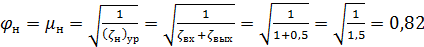 При истечении под уровень (ζ н)ур= ζ вх+ ζ вых =0, 5+1, 0=1, 5. Коэффициенты скорости и расхода насадка в случаях: - истечения в атмосферу