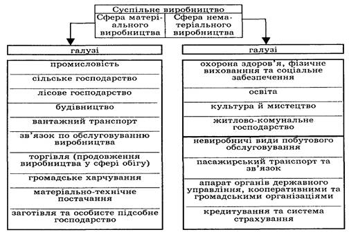 Суспільне виробництво структурно неоднорідне. Воно включає в себе два види (сфери) виробництва: матеріальне та нематеріальне виробництво (див. Рис. 2.3. Структура суспільного виробництва [1, c. 52 ]