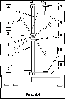 Изучение законов вращательного движения в настоящей работе проводится на специальной экспериментальной установке, называемой маятником Обербека. Устройство экспериментальной установки схематически показано на рисунке 6.4. Во втулке 1 со шкивом 2, свободно вращающимся вокруг горизонтальной оси, под прямым углом друг к другу закреплены четыре стержня, образующих крестовину. На стержнях закреплены винтами четыре одинаковых груза 3, массой m 1 каждый. Передвигая грузы по стержням, можно изменять момент инерции крестовины с грузами. При этом необходимо следить за тем, чтобы грузы располагались симметрично относительно оси вращения. При правильном расположении грузов крестовина в свободном состоянии должна находиться в состоянии безразличного равновесия (в противном случае при вращении на нее будут действовать переменные во времени моменты сил, которые могут исказить результаты измерений). Для сообщения крестовине равноускоренного вращения на шкив 2 навита нить 4, на свободном конце которой закреплен груз 5 массы m, которая регулируется количеством дисков-перегрузков, надетых на ось груза. Посредством неподвижной втулки 6 крестовина закреплена на вертикальной колонне 7, установленной в основании 8. На втулке 6 смонтирован также тормозной электромагнит, который при подаче на него напряжения питания, посредством фрикционной муфты удерживает маятник в состоянии покоя.