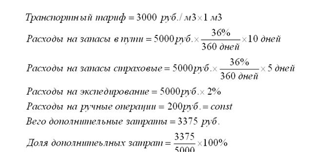 Расчет доли дополнительных затрат по доставке 1 м3 груза из города ЛГв Москву в стоимости этого груза осуществляют, разделив суммарные дополнительные расходы (графа 7 табл. 8) на стоимость 1 м3 (графа 1 табл. 8) и умножив полученное частное на 100. Результаты расчетов вносят в графу 8 табл. 8. Например, для груза с закупочной стоимостью 5 000 рублей получаем