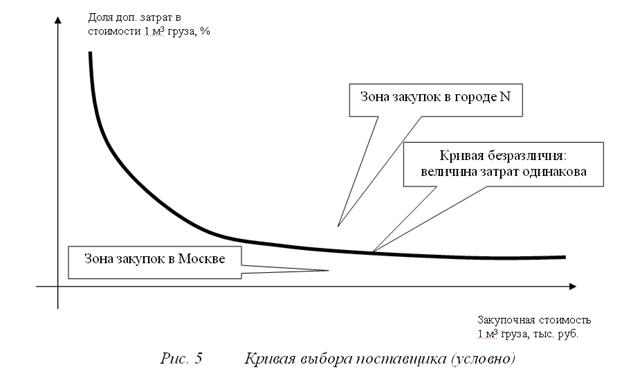 3. График зависимости доли дополнительных затрат в стоимости 1 мЗ от удель-3. График зависимости доли дополнительных затрат в стоимости 1м? от удельной стоимости груза строят в прямоугольной системе координат. По оси абсцисс (ОХ -горівоктальная) откладывают закупочную стоимость 1 мЗ груза (графа 1 табл. 8), по оси ординат (ОТ— вертикальная) - долю дополнительных затрат в стоимости 1 мЗ при закупке в городе N (графа 8 табл. 8)3. Общий вид кривой выбора удаленного поставщика приведен на рис. 5.