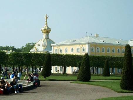 Рис. _. Петергоф У цей час в Англії на перше місце вийшло господарське значення живоплотів, що особливої популярності набуло з розширенням фермерських господарств у ХVIII – XIX століттях. Донині тут збереглося багато стародавніх огорож, вік яких – понад 100 років. Вони – національна гордість англійців і охороняються законом, а власники цих зелених скарбів одержують від держави фінансову підтримку для їхнього збереження і догляду. Найбільша жива огорожа, яку ботаніки і садівники називають садовим дивом, прикрашає парк Ерл Батхурст у Кіренкестері (Англія). Для щорічного підрізування тисової огорожі в країні класично доглянутих садів потрібно не менше десяти днів. Ця огорожа, посаджена у 1720 році, має довжину 155 м, висоту – 11 м, ширину – 4, 5 м. Загалом у Королівстві Великобританія топіарне мистецтво розвинулося на високому рівні, про що свідчать кадри презентації (інтернет-презентація). З частковим поверненням наприкінці XIX століття до будівництва регулярних садів і парків, з подальшим розвитком нових заходів, які поєднують елементи регулярного і ландшафтного стилю, топіарне мистецтво відроджується знову. Формовані рослини здебільшого використовували на ділянках садів і парків з регулярним плануванням, а також у партерних насадженнях поблизу будинків. В останньому випадку за допомогою строгих геометричних форм найповніше досягається єдність стилю будинку і навколишніх зелених насаджень. Зразками застосування формованих насаджень є сквери. Українським садовим майстрам топіарне мистецтво було знайоме вже у середині XVII століття. Його застосовували у формуванні звичайних живоплотів, для огородження розсадників і городів, а також при створенні шпалер, арок, тунелів, боскетів, фігурних стрижок окремих чагарників, що прикрашали партери багатих садиб. У Стрийському парку, що є перлиною м. Львова, донині зростає грабова зелена стіна, яка є незмінним атрибутом цього садово-паркового об’єкта.