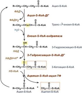 Далее в матриксе осуществляется расщепление жирных кислоты на 2-х углеродные фрагменты: рис 2. Окисление ненасыщенных жирной кислоты включает 2 этапа: 1. Выравнивание конфигурации за счет переноса группы СО из цис- в трансположение. 2. Гидратация присоединение OH-группы по 2-й связи и далее обычно. Окисление жирной кислоты с нечетным числом атомов углерода, обычное расщепление 2-х углеродных фрагментов дает в конце пропионил СоА, он карбоксилируется и изомеризуется, происходит внутримолекулярная перестройка –образуется сукцинил СоА.
