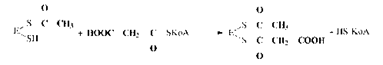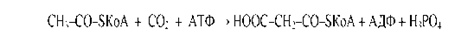 Из данного уравнения можно видеть, что для синтеза жирной кислоты требуется всего одна молекула ацетил-КоА, служащая «затравкой». Непосредственным источником синтеза является малонил-КоА, который образуется из ацетил-КоА по реакции: