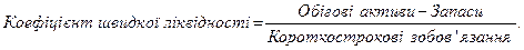 Матеріально виробничі запаси звичайно є найменш ліквідними з обігових активів підприємства. Отже, коефіцієнт швидкої ліквідності - це міра здатності підприємства з погашення короткострокових боргових зобов’язань, причому без необхідності у реалізації матеріально виробничих запасів.