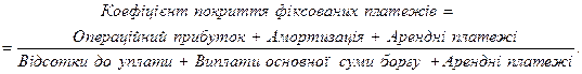 Коефіцієнт покриття відсотків показує, у якому ступені може знизиться операційний прибуток, а компанія залишиться ще у змозі обслуговувати свої відсоткові платежі. в) Коефіцієнт покриття фіксованих платежів. Коефіцієнт покриття відсотків корисний для оцінки здатності компанії відраховувати відсотки з заборгованості. Однак цей показник має два недоліки: · відсотки - це не єдині фіксовані витрати компанії; · прибуток до оподаткування не представляє в точності потік коштів. Для урахування даних обставин використовується такий показник, як коефіцієнт покриття фіксованих платежів