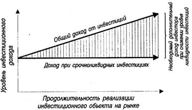 ІІ. Розрахунок необхідного рівня доходності інвестиційних операцій з урахуванням фактора ліквідності оснований на взаємозв’язку цих показників, що визначають шкалу «доходність - ліквідність». Економічна поведінка інвестора спрямована на підбір високоліквідних об’єктів інвестування при інших рівних умовах, тому що це забезпечує йому можливість для маневру фінансовими ресурсами у процесі управління інвестиційним портфелем. Для того, щоб інвестор був зацікавлений у виборі середньо- і низьколіквідних об’єктів інвестування, він повинен отримати певні стимули у вигляді додаткового інвестиційного доходу. Чим нижче рівень (коефіцієнт) ліквідності об’єкту інвестування, тим вищий повинен бути розмір інвестиційного доходу або премія за ліквідність. Графічно ця залежність представлена на рис. 3.2.