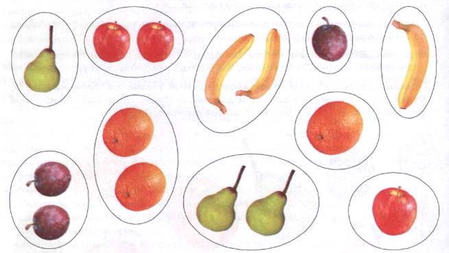7. Упражнение «Поваренок»: Расскажи, что нужно сделать, чтобы приготовить компот? (Фрукты моют, чистят, режут на дольки, варят.) Сок? Пирог? 8. Упражнение «Назови правильно»: Задание 1: Покажи, где яблоко, яблоки и т.д. и соедини линиями одинаковые фрукты. Задание 2: Взрослый показывает, а ребенок называет фрукты. Образец: «Это яблоко. Это груши».