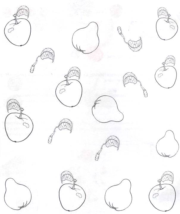 12. Упражнение «Дорисуй»: Дорисуй каждой груше веточку, каждой веточке с листочком сливу, а яблоки раскрась. Не забудь, что эти фрукты бывают разного цвета.