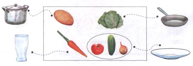 7. Упражнение «Поваренок»: Расскажи, что нужно сделать, чтобы приготовить суп? (Овощи моют, чистят, режут, варят.) Сок? Пюре? 8. Упражнение «Назови правильно»: Задание 1: Покажи, где огурец, огурцы и т. д. Соедини линиями одинаковые овощи. Задание 2: Взрослый показывает, а ребенок называет овощи. Образец: «Это помидор. Это помидоры».