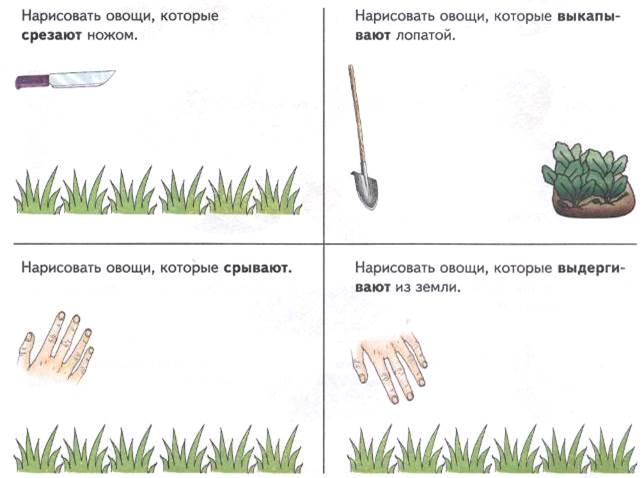 12. Упражнение «Нарисуй»: Рассказать ребенку, где растут овощи и как их убирают с грядки. Выполнить предложенные ниже задания.