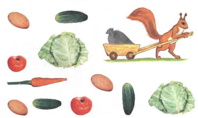 14. Упражнение «Что купила белочка в магазине»: Рассмотри рисунки. Сравни их и назови, что увезла белочка из магазина.