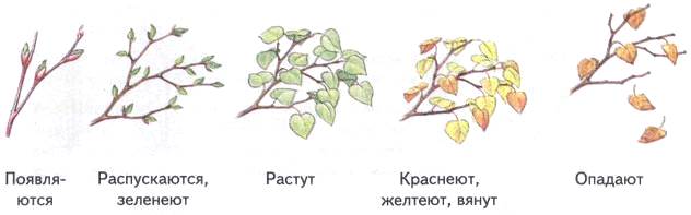6. Упражнение «С какого дерева лист, веточка?»: Раскрась расположенные выше листья и веточки. Проведи линию от каждого из них к соответствующему дереву. Назови, какие это листья и веточки. (Лист березы — березовый. И т. д.) 7. Упражнение «Что происходит с листьями?»: Составь рассказ по картинкам и опорным словам.