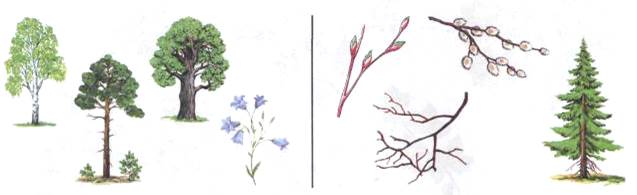 4. Упражнение «Скажи наоборот»: Сосна высокая, а рябина низкая. У сосны иглы длинные, а у ели.... У дуба ствол толстый, а у березы.... У клена листья большие, а у березы.... У березы ствол светлый, а у клена.... 5. Упражнение «Закончи предложения нужными словами»: