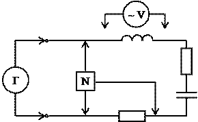 2. Описание установки. Объектом исследования является цепь переменного тока, содержащая последовательно соединенные катушку индуктивности L, резисторы R100 с номиналом 100 Ом, R1 с номиналом 1 Ом, конденсатор С, изображенные на рис. 1. Источником питания для данной схемы является генератор синусоидальных сигналов Г. Для измерения напряжений на элементах схемы используется цифровой вольтметр V. Осциллограф N позволяет измерить разность фаз между током и напряжением в цепи.