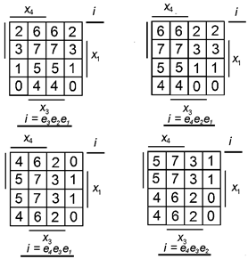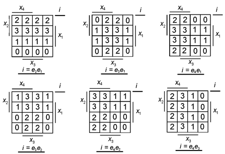 4.6 Синтез на двухразрядных 4-канальных мультиплексорах Двухразрядные мультиплексоры 4→ 1 достаточно просто использовать для реализации двух функций трех и четырех переменных. Пусть функции f 1(v) и f 2(v) заданы диаграммами Вейча (рис. 4.7, а, б). Мультиплексор 4→ 1 имеет два адресных входа, а значит, возможны шесть вариантов выбора переменных для адресных сигналов: x 2и x 1, x 3и x 1, x 4и x 1, x 3и x 2, x 4 и x 2, x 4и x 3. Соответствующие числа i = ep eq (p ≠ q) будут определять адреса каналов мультиплексора. Так как числа i двухразрядные, то они будут разбивать диаграмму Вейча четырех переменных на четыре части, каждая из которых представляет собой диаграмму Вейча для двух переменных, не использованных в качестве адресных. На (рис. 4.15) показаны все шесть вариантов разбиения диаграмм Вейча адресами i. Так как адресные сигналы у двухразрядного мультиплексора 4→ 1 общие для обоих разрядов, то можно проводить только совместную минимизацию функций f1(v) и f2(v). Для оптимального выбора адресных переменных следует подсчитать общее число первичных термов