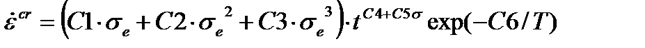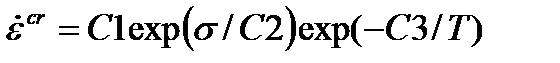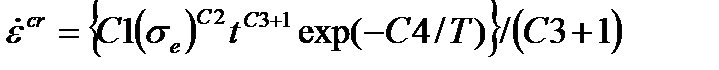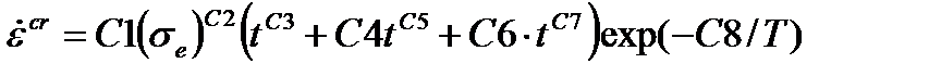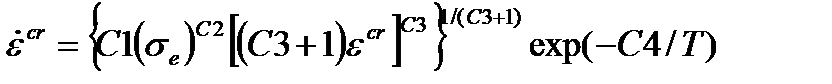 Соотношения, определяющие скорость деформаций ползучести для некоторых моделей ползучести приведены в таблице 4.1. При этом в таблице 4.1 приняты следующие обозначения: T – температура в градусах Кельвина; t – время в конце шага интегрирования; С1...С12 – константы материала определяемые для каждой модели (в разных моделях одинаковыми символами могут обозначаться разные по физическому смыслу константы). Поскольку получение всех констант С1...С12 для конкретного материала может представлять трудность, а поведение материала не всегда соответствует указанным ниже моделям, в пакетах МКЭ обычно предусмотрена возможность задавать пользовательские модели ползучести.