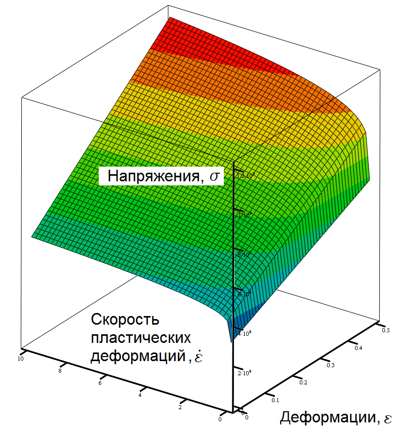 В модели учитывается изменение предела текучести материала в зависимости от скорости деформирования. По сути данная модель является расширенной версией моделей, описанных выше в разделе 4.1, и используется при анализе поведения материала в случае высоких скоростей деформаций, например при ударе. Для случая изотропного упрочнения имеем следующую формулу для предела текучести материала: