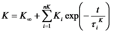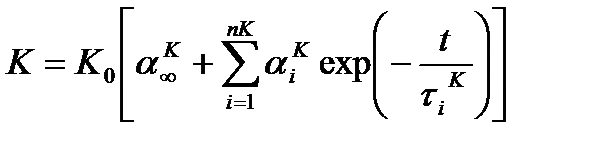 K(t) – ядро релаксации для объемного модуля; t – текущее время; τ – прошлое время. Ядра релаксации раскладываются в ряды Прони: