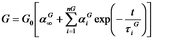 где i – номер члена ряда Прони; Gi и Ki – члены ряда Прони для модулей сдвига и объемного сжатия соответственно; G∞ и K∞ – финальные модули сдвига и объемного сжатия соответственно; nG и nK – число членов ряда Прони для модулей сдвига и объемного сжатия соответственно; τ iG и τ iК – время релаксации для соответствующего члена ряда Прони. Введем начальный (мгновенный) модуль сдвига